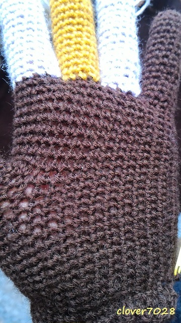 編み順の関係で指の配色がこうなりました。