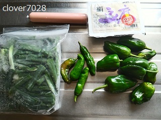 材料は畑で採れた未成熟ピーマン、固くなったシシトウガラシ、ネギ。