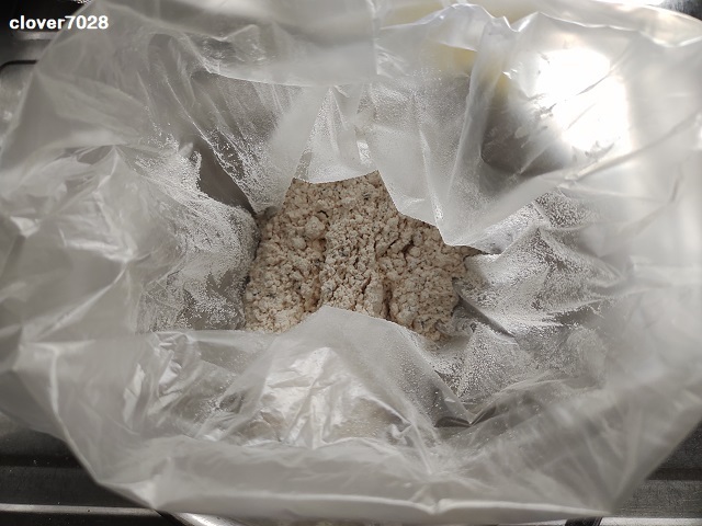 全ての粉をビニール袋に入れてふりふり。