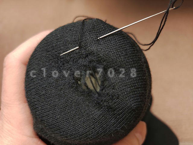 ダーニングマッシュルームなどと言う高級なモノは持っていないので、空き瓶を使っています。