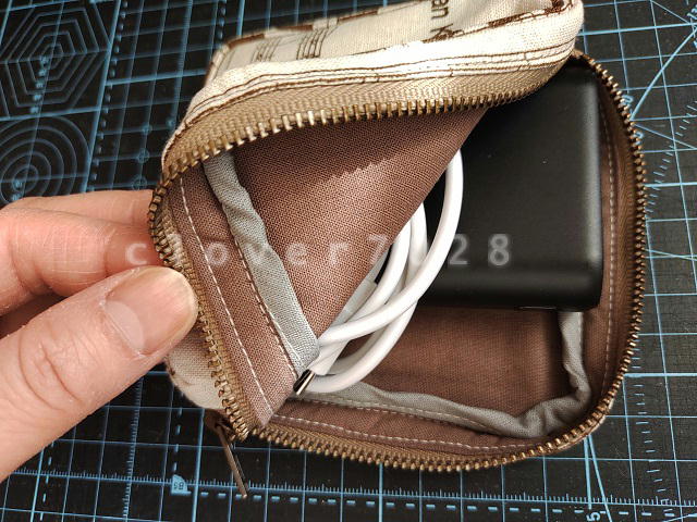 中に入れる予定だったモバイルバッテリーはピッタリ収納できたのですが、マチの幅がもう少し広い方がよさそうなので、型紙を書き直してまた作ってみます。
