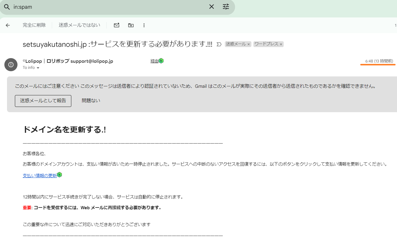 今日の節約行動(2024年6月20日くもり)危な!詐欺に引っかかるところだった!Lolipopからの「ドメインを更新する必要があります」は詐欺メール!