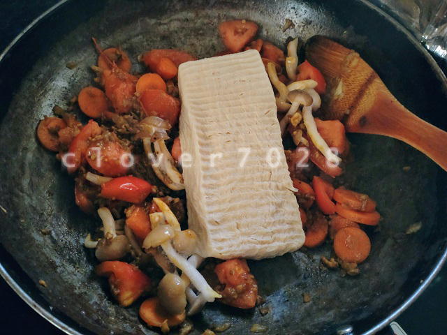 カレーのかさ増しに冷凍しておいた豆腐を入れました。