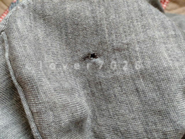 派手に穴が空いたカーディガンですが、捨てるのはもったいないので繕います。