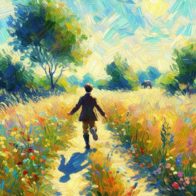 今日の画像もAI作で、お題は「楽しく歩いている人を印象派風に」