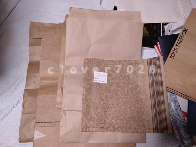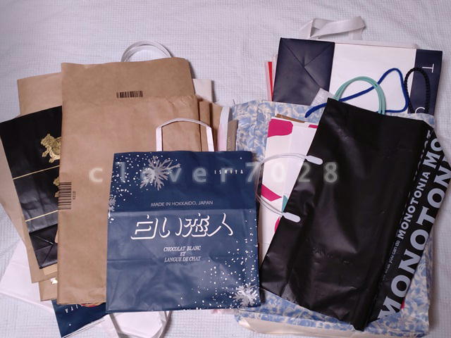 はじめは大きめの紙袋(水色の花柄の袋)に横倒しにして全部入れていたけれど、入らなくなってその上に積み上げ始めて、そのまま増えていったのでした。
