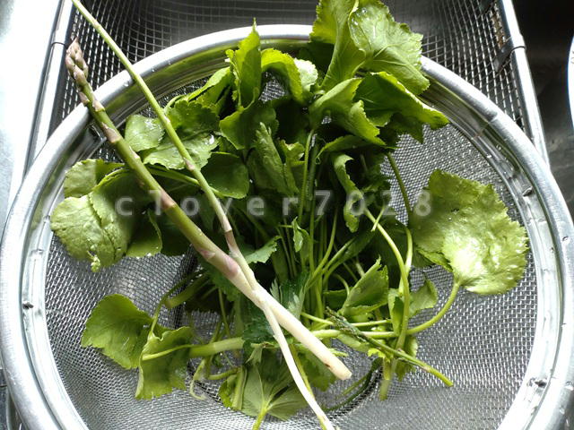 途中で引っこ抜いたアスパラと、別の場所で勝手に生えてきた三つ葉です。