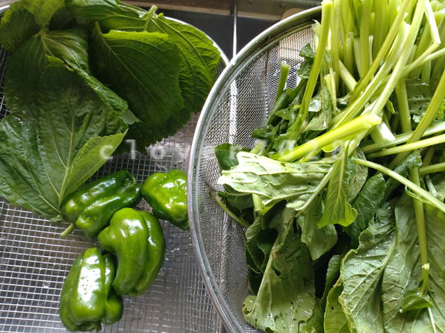 えごまの葉はいただきもので、ピーマンと小松菜がうちの畑で採れた野菜です。