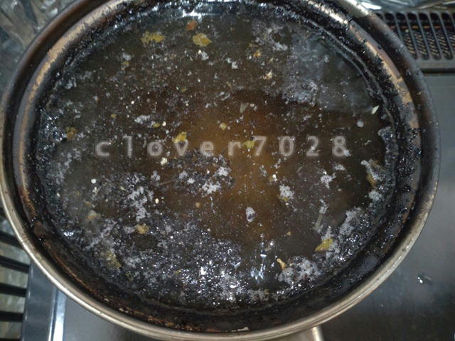 これは重曹で焦げ落とし中の写真です。こんなの初めて見ました。火事にならなくてよかった。。。