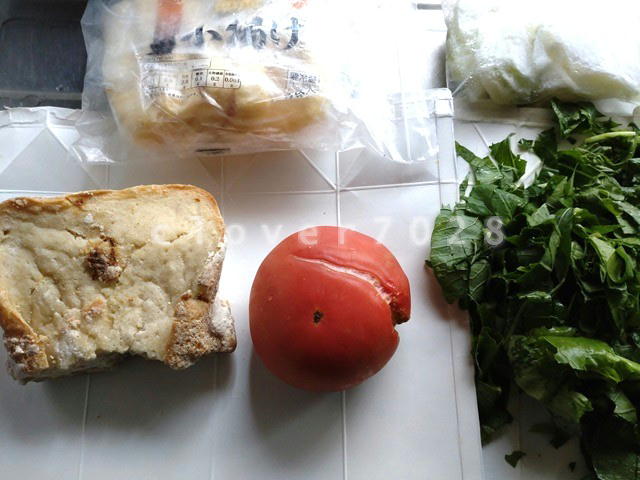 他の具材は玉ねぎ、割れたトマト、小松菜、油揚げ、ブナシメジです。タンパク質不足になるのでゆで卵を作りました。