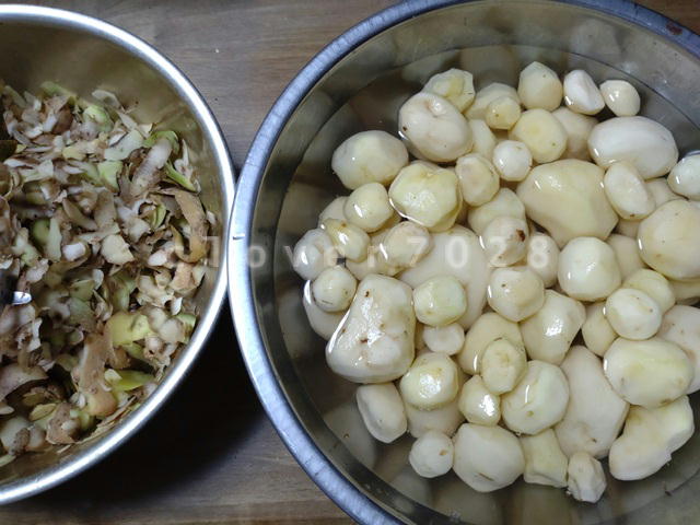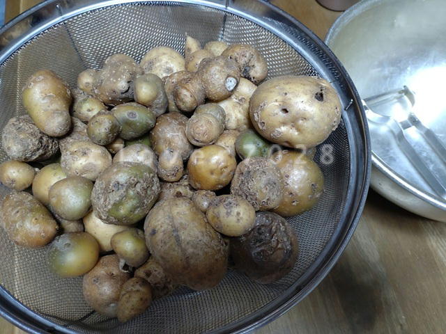 先月の話ですが、ジャガイモを収穫した後、小さかったり青かったり、できが良くなくてそのまま畑に転がされていたイモを母が「もったいない」と拾い集めてきました。
