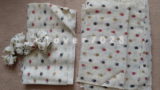 先日、自宅の古い布で風呂敷を作り、残りの半端な生地を
